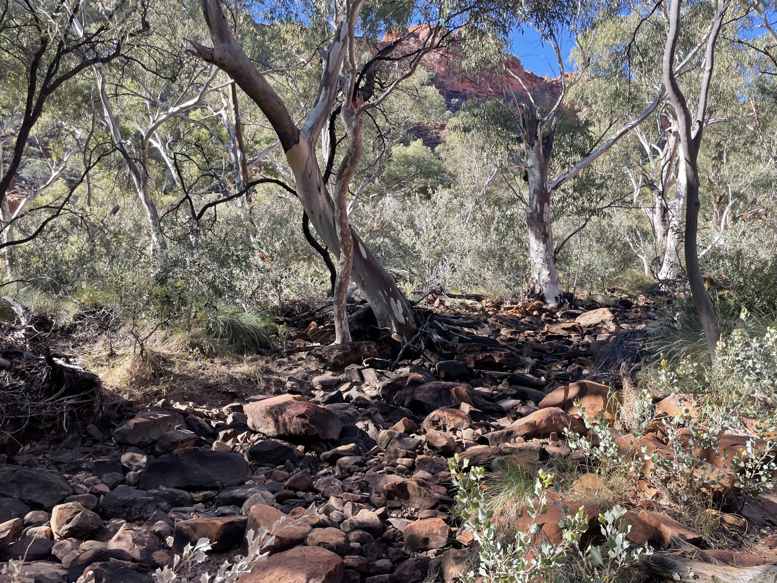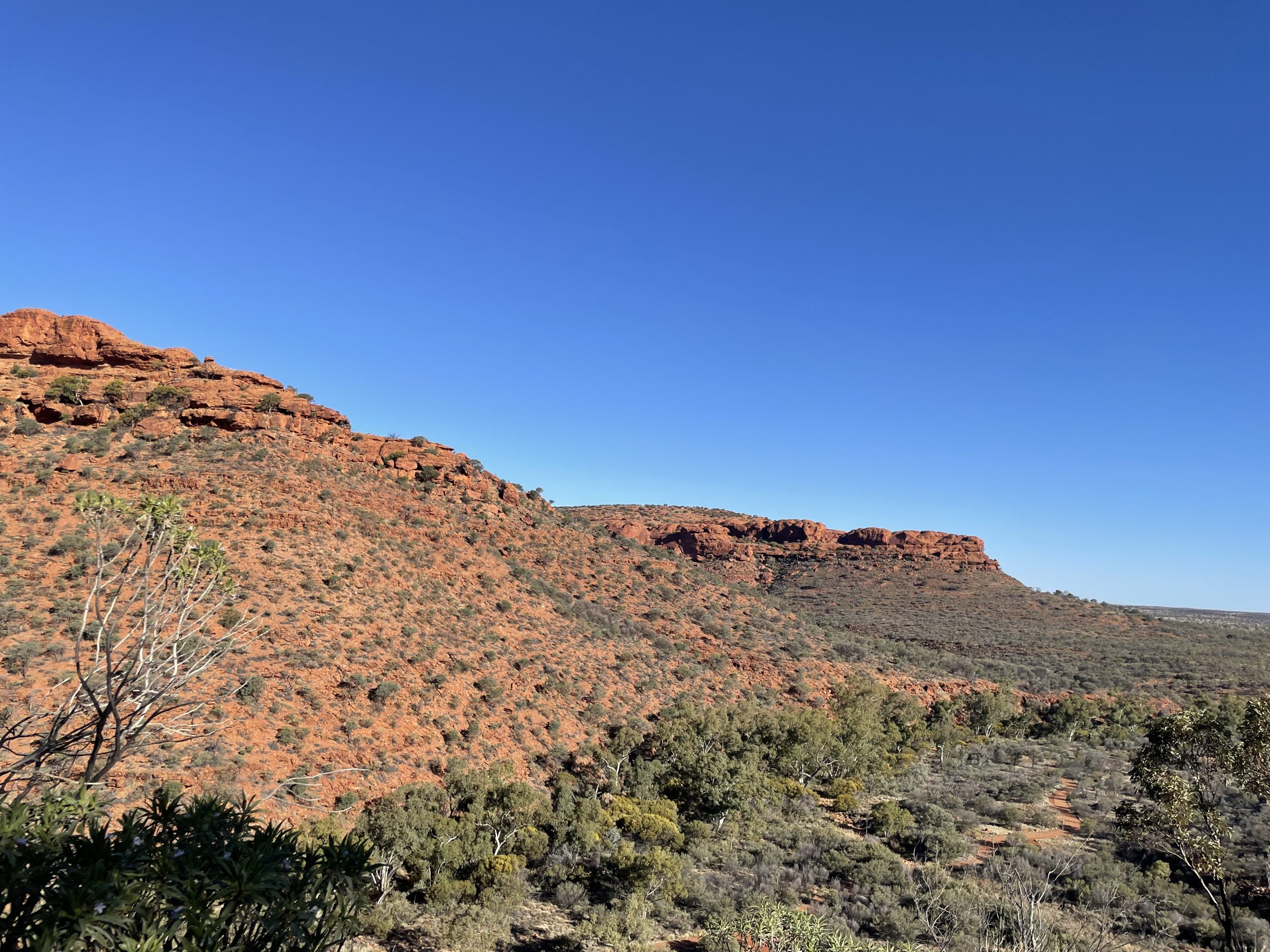 Today started pretty early as we had to hitch up to the van and drive to Kings Canyon. The drive took about 3 hours to get here, and once we unpacked, we drove to the Kings Creek Walk inside Kings Canyon. The walk follows a dried-up creek that goes through the middle of the canyon with a bunch of trees all through it. The walk goes for about an hour and it was cool to see all the birds and wildlife in the walk. At the end of the walk, there is a viewing platform that stands above the ground and lets you see all the animals in the middle of Kings Canyon. While we were there, we saw a mature King Brown Snake on the floor. It was really well camouflaged and I only saw it because I was watching a bird watching the snake. It was super long and it was really cool to see it. After we came back to the entrance of the walk, I decided to go up the stairs for the rim walk which goes about 120 meters up a mountain. It took me about 7 minutes to climb all the way up and it was super exhausting. At least I got some really good photos of Kings Canyon though! After we came back to the van, we had dinner and played another game of Rummikub and then went to bed.