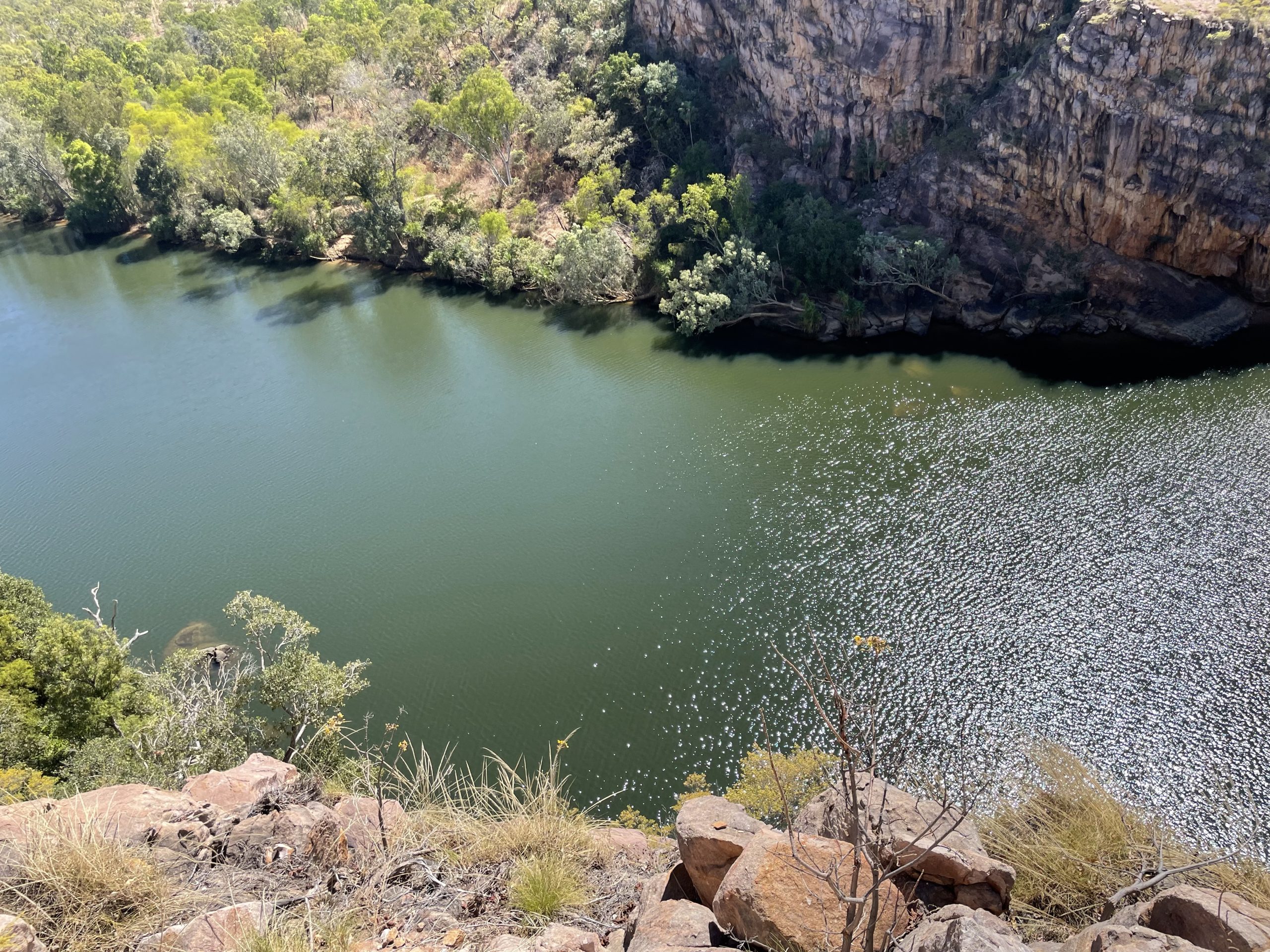 We started by getting up a bit later to go to the Katherine Gorge Walk. The walk was about 1 and a half hours and it started by walking past these trees with thousands of bats hanging off of them. There was about 20 trees completely covered in bats and they really stank! After that, we kept walking to a lookout that had a view of the entire river. There are crocodiles and lots of fish in there and we might of seen a crocodile resting on a rock just under the water but we weren’t sure. After that, we went over to a small group of palm trees and ferns which looked really nice. You could also see trails in the grass where animals had ran through the grass. Then we got back to the van and went into the Katherine Hot Springs which was good. It was a little colder than the other hotsprings but I had fun. There were also lots of small waterfalls in the hot springs which were fun to go over. After that, we had dinner and went to bed.