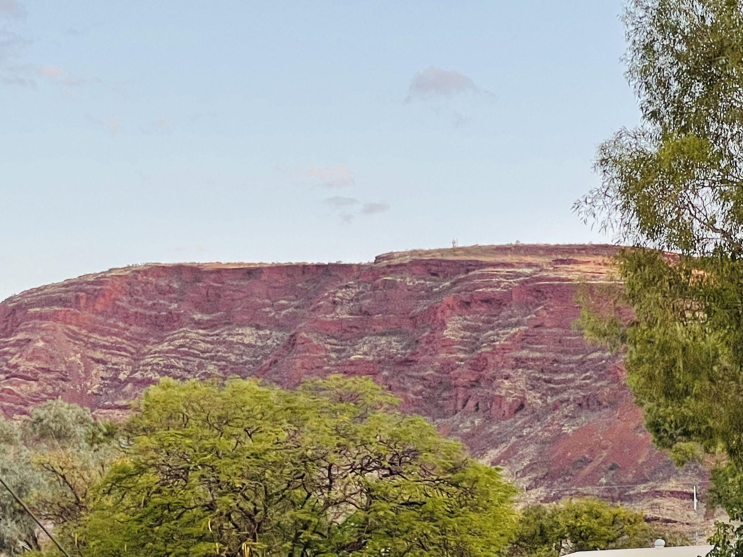Today was another long drive with it being 5 hours. We began by driving out of Port Hedland and on the way, we saw another one of those really long trains. While we were driving, we saw heaps of massive road trains, some of them having 4 trailers. In Western Australia, the road trains can go much longer than the rest of Australia. In South Australia and the Northern Territory, they are limited to 3 trailers or 53.5 meters long. In Western Australia, there is no limit. The longest road train is over a kilometre long! After that, we stopped at the Auski roadhouse for lunch. When we got to Tom Price, we set up the van and took a look around the caravan park. It is right at the foot of a big mountain called Mount Nameless. I guess they really couldn’t think of a name for it. It is pretty tall and apparently there are some lookouts on it. There are also heaps of galah’s flying around the caravan park and one came right to our door. Tomorrow, we are going to Karajini to look at the iron mines and gorges that are there.