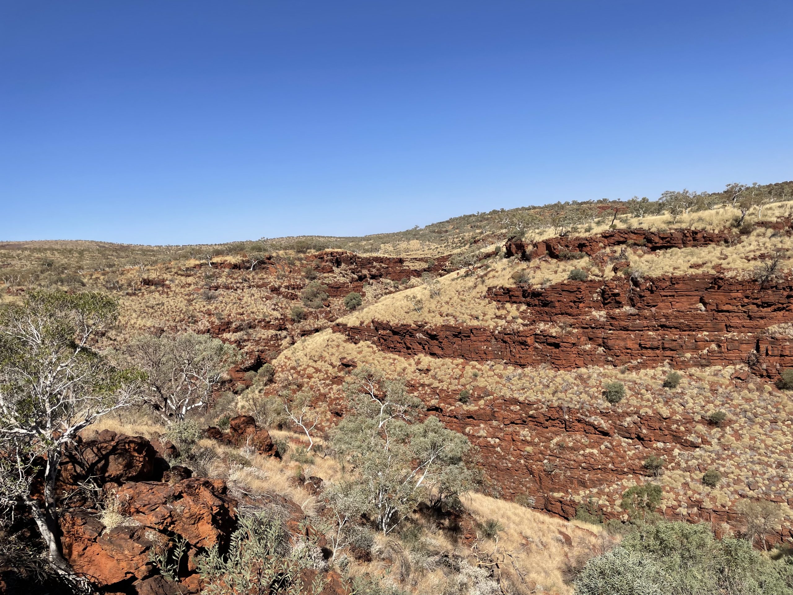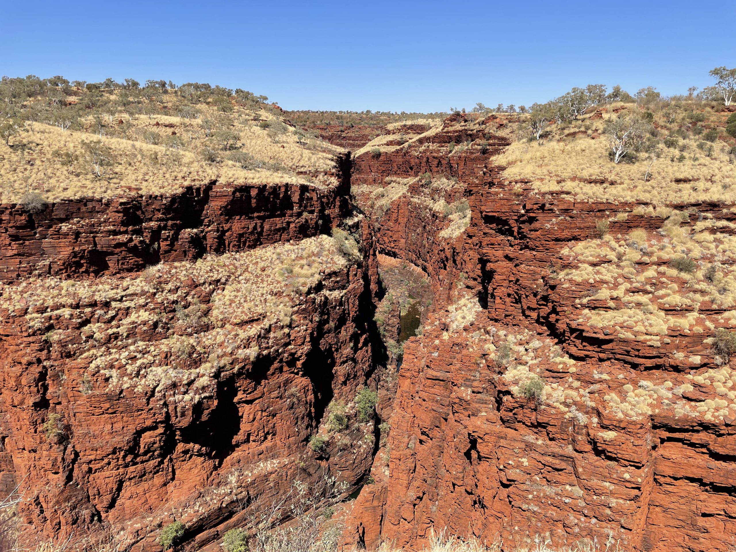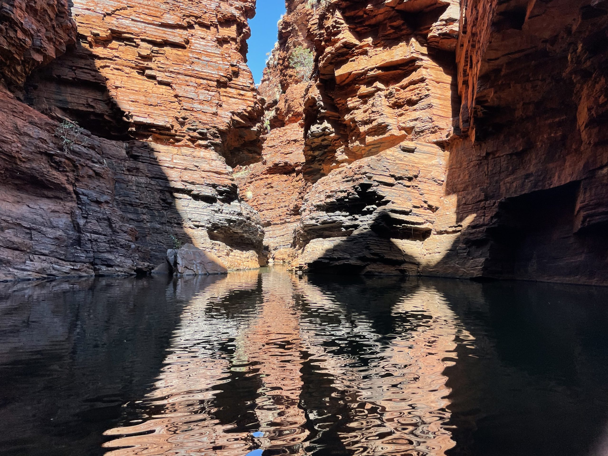 Today I woke up with a virus. I felt pretty bad, but we still went to Karajini to look at the gorges. The first part was a small walk to a lookout that had all the gorges going under it. The next thing we did was we went down a lot of stairs o the bottom of one of the gorges. We had to climb around on the sides of some rocks to get past a pool of water. Once we got past the water, we had to climb around a small stream of water going down into a swimming hole. It was pretty hard and one time I had to put my feet on the wall and shuffle along like that. After that, it got to a platform over the swimming hole. There was a rail going down a flat bit of rock and you had to hold onto the rail with both hands like a repelling cable. When we got to the bottom, we didn’t have our bathers on, so we didn’t swim in it. The water would have also been freezing cold and there were lots of signs saying be careful of hypothermia. The pool looked really nice and there was a small channel that kept going out the back of it. When we came back out of the gorge, we ate lunch in the car. After we ate lunch, we went to a category 5 walk. It started with a massive ladder going about 100 meters down into the gorge. We then had to climb over a lot of hard rocks to climb over. We then had to wade through knee deep water which was freezing cold. The stones were also super sharp and slippery. After we waded through the long water hole, we got to a point where you either had to climb over super slippery and super thin rocks or you had to swim through a long creek. I left my bathers in the car, but I still swam through in my clothes. It was freezing in the water, but you went numb after a while, so it was ok. We had to climb over some rocks that were really slippery because my feet were wet, and I had no shoes on. I had to go around a lot of rocks, and we went into a natural amphitheatre which was pretty cool. We had to go through a waterfall after that and it was really hard. You had to sort of crawl your way down it to the main pool. After that, I went into the main pool, and it was pretty good. Even though it was freezing it was fun to swim around in there. After I got out, it was hard to get back because I was shivering so much. After we got out of the gorge, we drove around to a few others, but we didn’t go down any. Then we came back to Tom Price, and we had dinner.