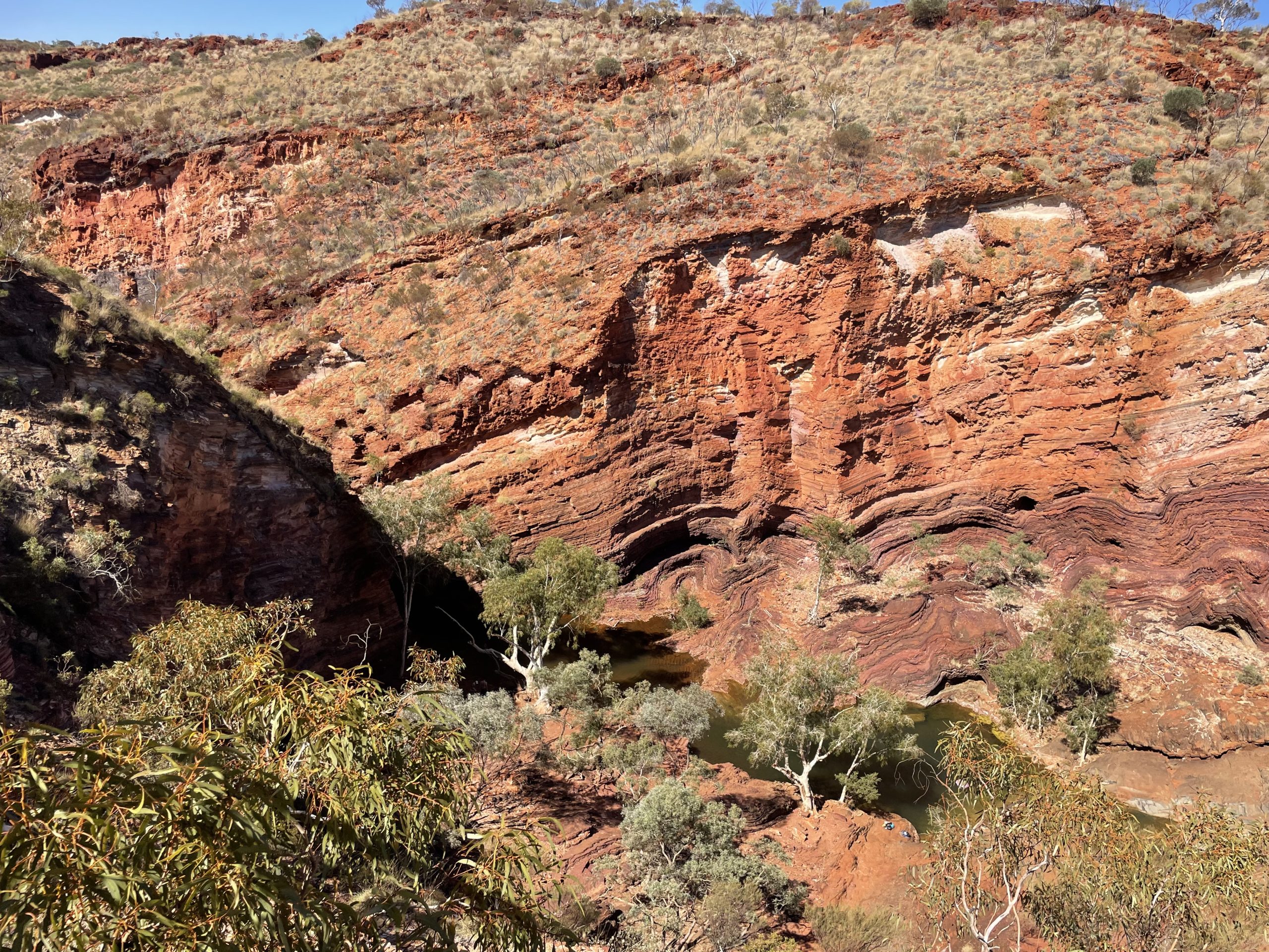 We got up at around 10 am today to do a tour on the mine. We began at the visitor centre where we got our safety helmets and goggles. We then entered a tour bus to take us to the mine. It was about a 10-minute drive there and the first thing we saw was a 2-kilometre-long train leaving the mine loaded with iron ore. We then drove past a big hopper that loads the iron ore onto the train. We had to stop at a small spot and wait because we needed permission to go to the actual mine. There is some shale down there and it can spontaneously combust and release toxic gas into the air. It was fine for us today, so we got to go up to the mine. It is an open top mine in Tom Price, so we didn’t have to go underground to see it. Currently it is a massive pit in the ground with some water in the bottom. The water looked quite nice to swim in except that apparently it was acidic waste from the mining equipment. We got to see all these different pieces of iron ore and they explained the difference in low- and high-grade iron ore to us. They also explained how they mined it except it was very complicated and a lot of it went over my head so I can’t explain it. There was also this very big, decommissioned digger at the mine which was cool. A really big water carrying truck came by, spraying the roads with water to prevent dust from picking up. Apparently, they can hold 100,000 litres of water in them. After that, they took us around the rest of the mine. We went to a lot of facilities, and we even saw some conveyor belts carrying iron ore with them. After we went to the mine, we came back to the van for about an hour and then we went to Hamersly Gorge. It was an hour drive on a dirt road, but it was surprisingly smooth. When we got there, we climbed down about 150 stairs until we got to the bottom of the gorge. There was a big water pool right in front of us at the beginning, but we decided to go further on before swimming in there. The next part was really hard as it was a completely flat and smooth rock that was really slippery and steep. It took a long time to get up there and I almost fell backwards into the water multiple times. When we finally got there, we had to climb up another steep slope but this time it was very grippy and had lots of footholds in comparison to the other one. When we got up there, it was a really big drop to the next rocks, so I ended up finding my own path up a big mountain and then down around. By this point, we were next to a second swimming hole, but I wanted to get to the spa at the end of the walk. It was really difficult to climb over there though, so I had to turn around and go back. After that, we got into our bathers and swam through the swimming hole into the spa. It was so difficult to get in as the rocks below it were covered in algae which made it incredibly slippery. After a really long time of struggling to get up, we finally got in there. It was a small pool with a waterfall going into it, but it was only a tiny bit warmer than the other pool and still freezing. We then got out of that pool and came down to the next pool. It was very cold in there and even though it was 34 degrees, I was shivering a lot. I only spent a few minutes in that pool and then I came out. After that, we left the gorge and came back to the van. We then had dinner and went to bed.
