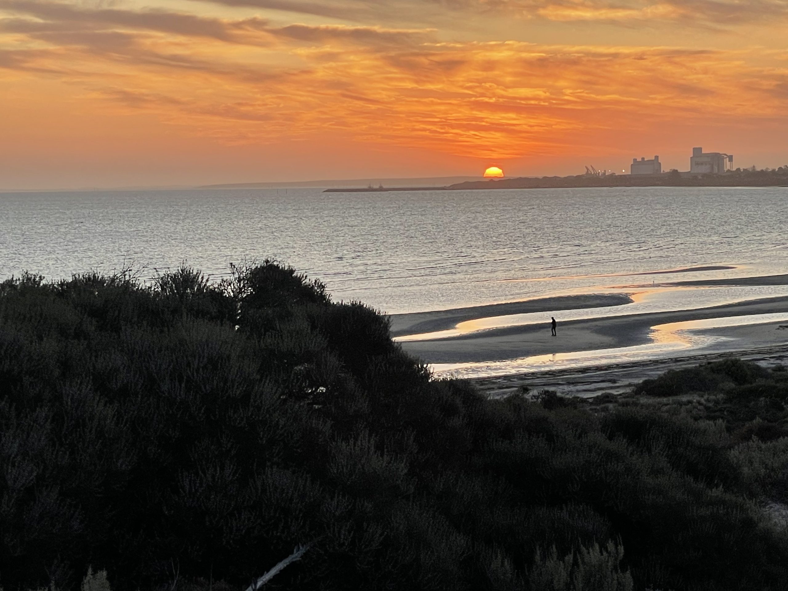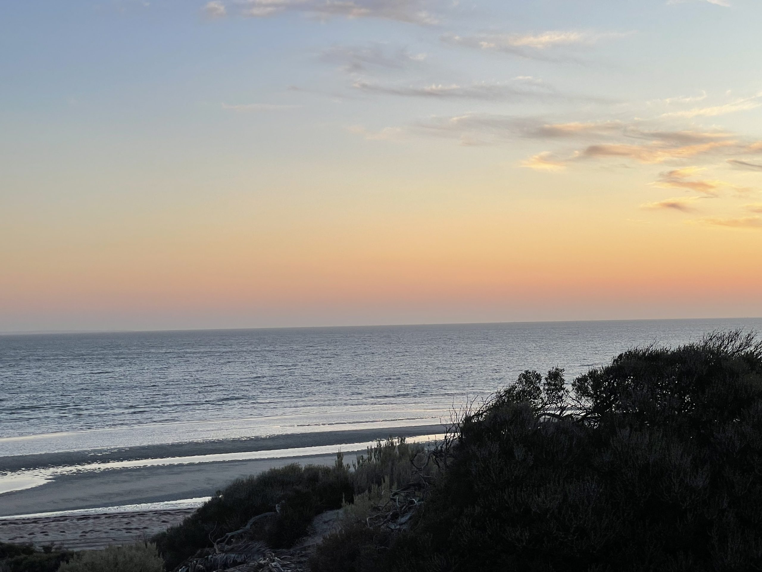 We got up in the morning and packed up the van to go across the Nullarbor Plain. On the way, we went over the South Australia border which meant we had to put our clocks forward another 45 minutes. We got to the Nullarbor Plain and I saw there were no trees there at all and it was completely empty of anything but saltbush. We stopped at a lookout on the way that went over the Great Australian Bight. You could see all the way along the cliffs with the waves hitting them. On the road, there were lots of lizards that we had to keep dodging. When we stopped for lunch, we found out that Nana and Pa’s car had broken down and that something was wrong with the engine. Pa called a tow truck to pick the car and their van up and Nana got in our car to go to Ceduna. The tow truck dropped Pa off about 2 hours before Ceduna because it was getting late. Nana had to stay in a cabin at the caravan park while Pa stayed at the van. Mum and Dad drove around Ceduna to look around and I climbed over the sand dunes to look at the water. The sun was halfway down the horizon when I got there so I was able to get a photo of it. The water looked pretty nice, and it had gone down a lot so there were these pools in the sandy bit. We came down to the van after that and had dinner and then went to bed.